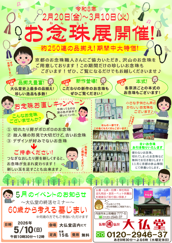 丹波市・丹波篠山市の仏壇・仏具は【大仏堂】 > ブログ > ✨もうすぐ念珠展開催✨