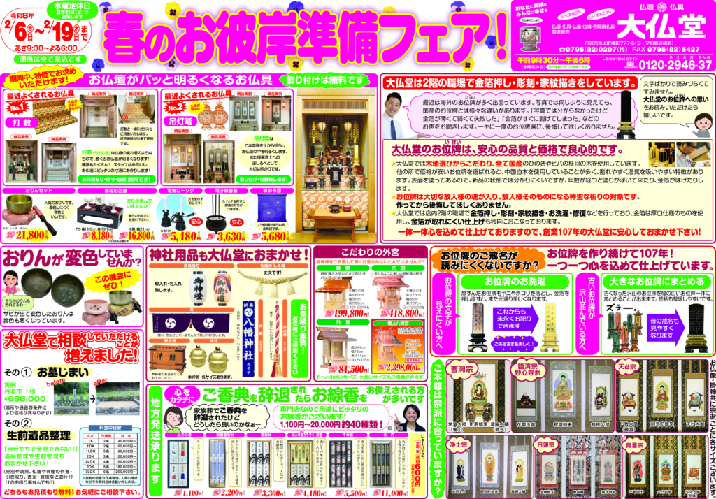 丹波市・丹波篠山市の仏壇・仏具は【大仏堂】 > お知らせ > 🌈春のお彼岸準備フェア開催中です🌈