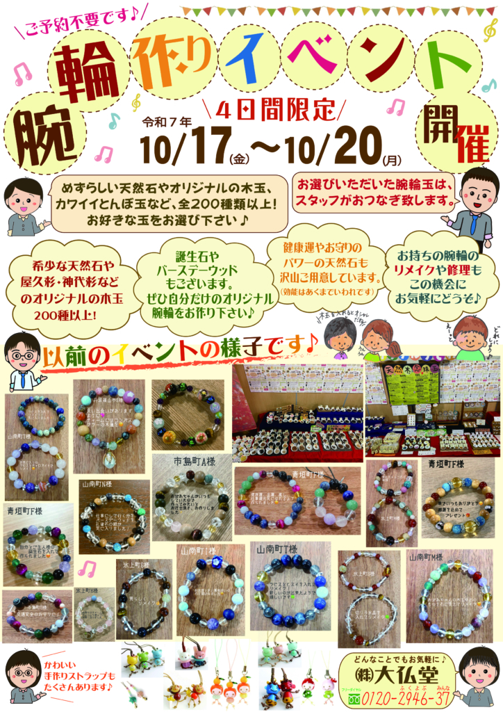 丹波市・丹波篠山市の仏壇・仏具は【大仏堂】 > お知らせ > 🌈10月のイベントのご案内🌈オリジナル腕輪作りしませんか✨