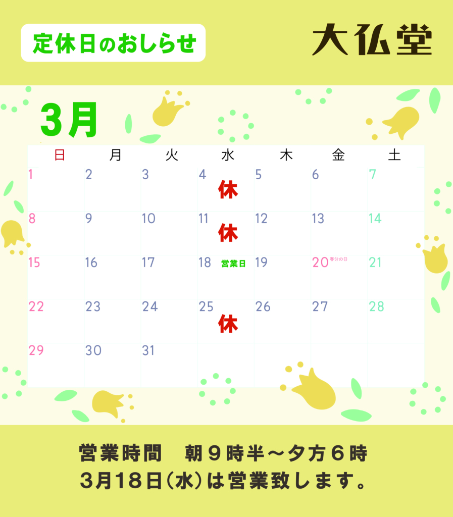 丹波市・丹波篠山市の仏壇・仏具は【大仏堂】 > お知らせ > 🌷3月の定休日のおしらせ🌷