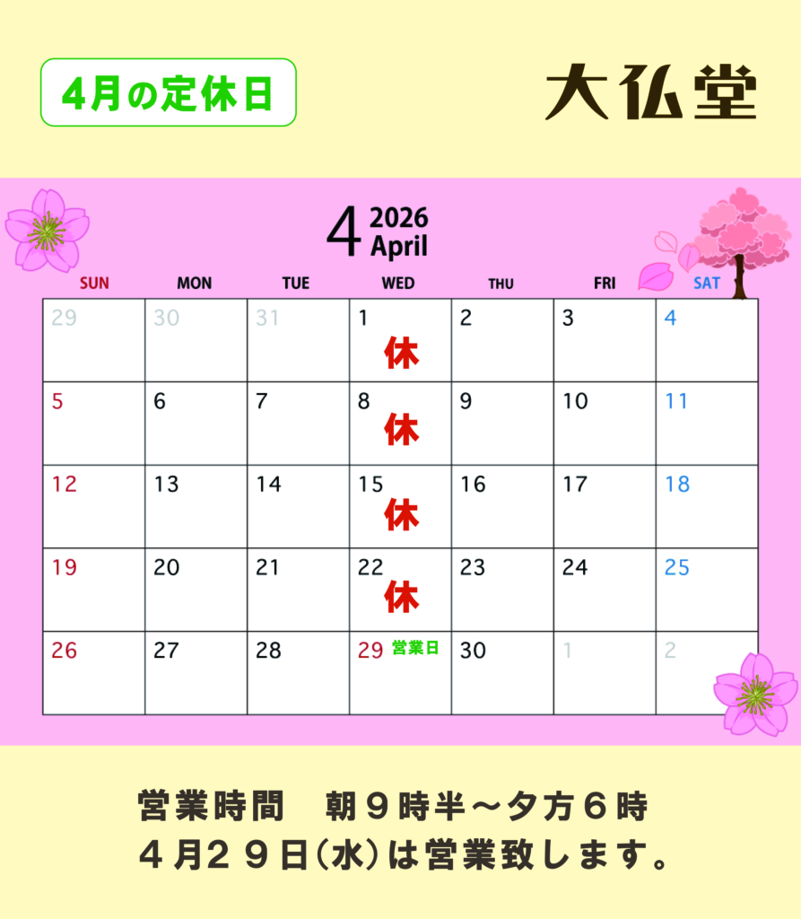 丹波市・丹波篠山市の仏壇・仏具は【大仏堂】 > お知らせ > 🌸4月の定休日のお知らせ🌸